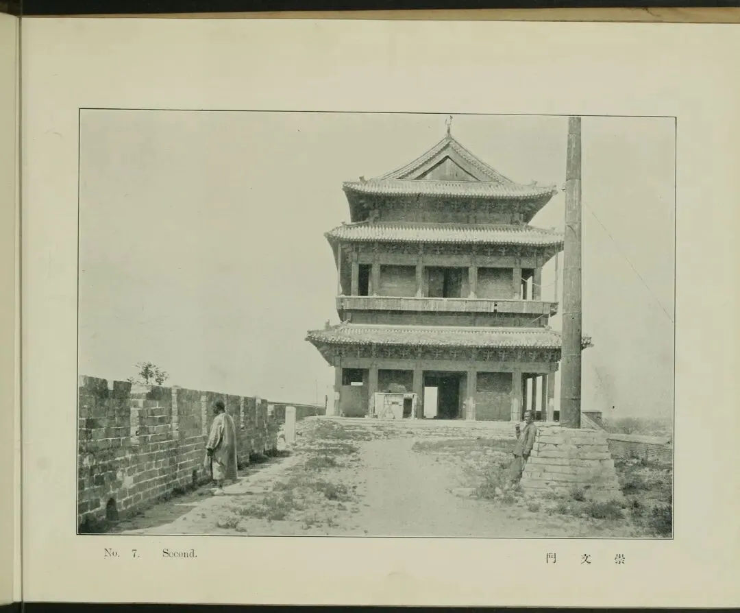 这是从城墙上拍摄的崇文门城楼。照片中城楼在高大的城墙之上,很是巍峨。两名穿着长衫的男子沿着城墙边的小路行走。