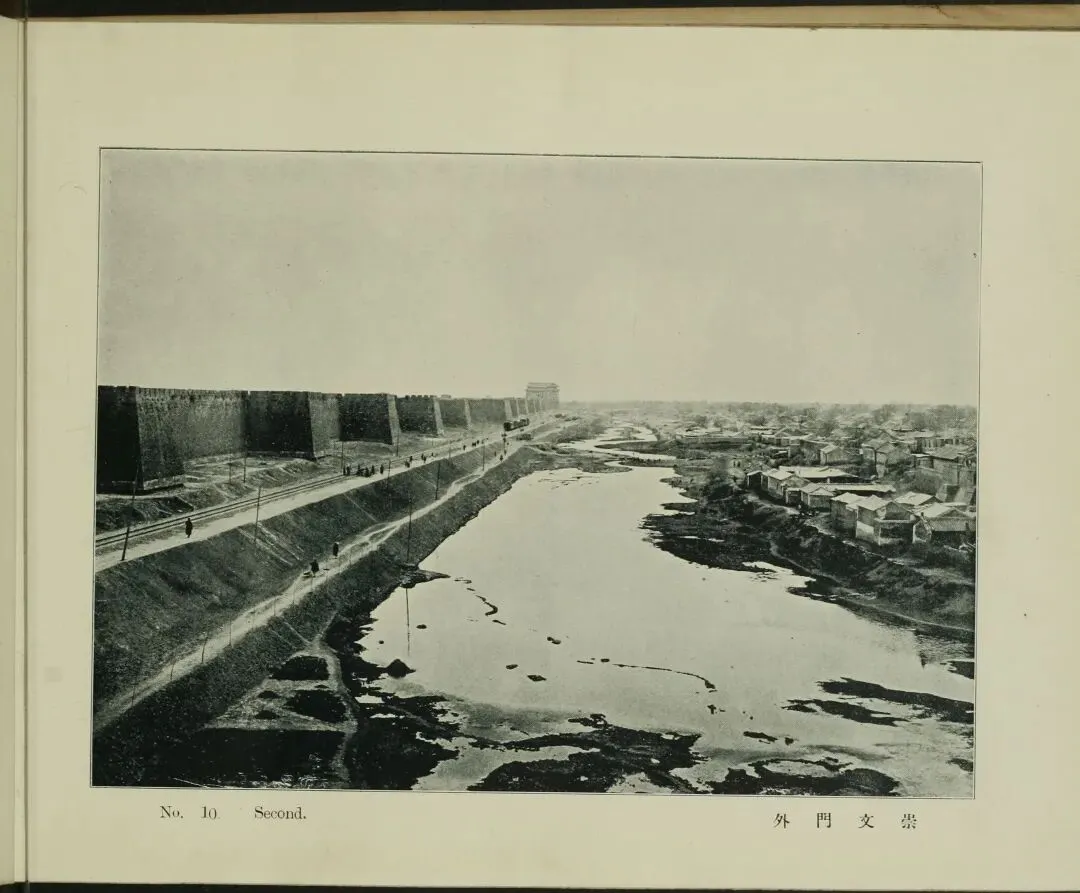 高大的城墙沿着护城河蜿蜒伸展,城墙下有铁路并行,行人在路基下的小路上行走。护城河的水质不清,岸边有人洗衣、捕鱼。