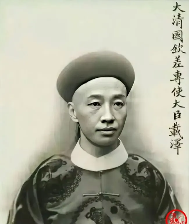 这个端严的半身像常被误认成某位王公,其实是载泽出洋前后的定装照,团龙补服压得很平,圆领里垫着白硬领,脸上没什么笑意,额角的发际线后退一点点,显得精神又清冷,旁边竖写着官名头衔,说明他那时已步入中枢了。