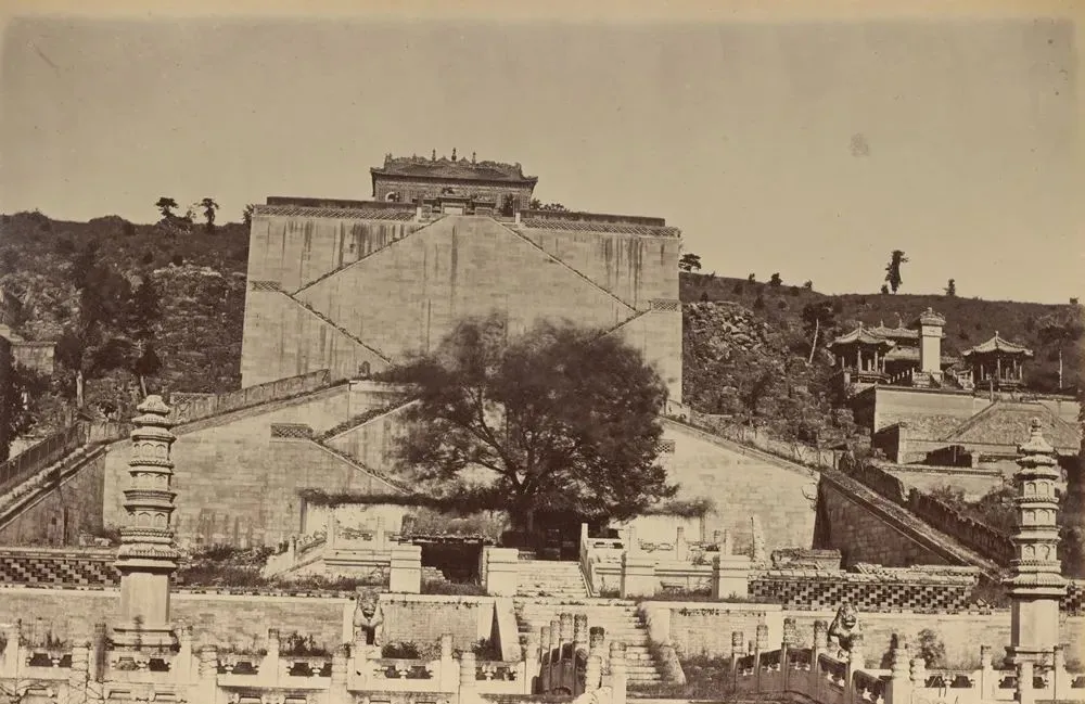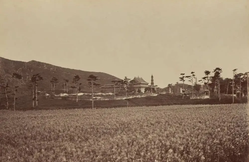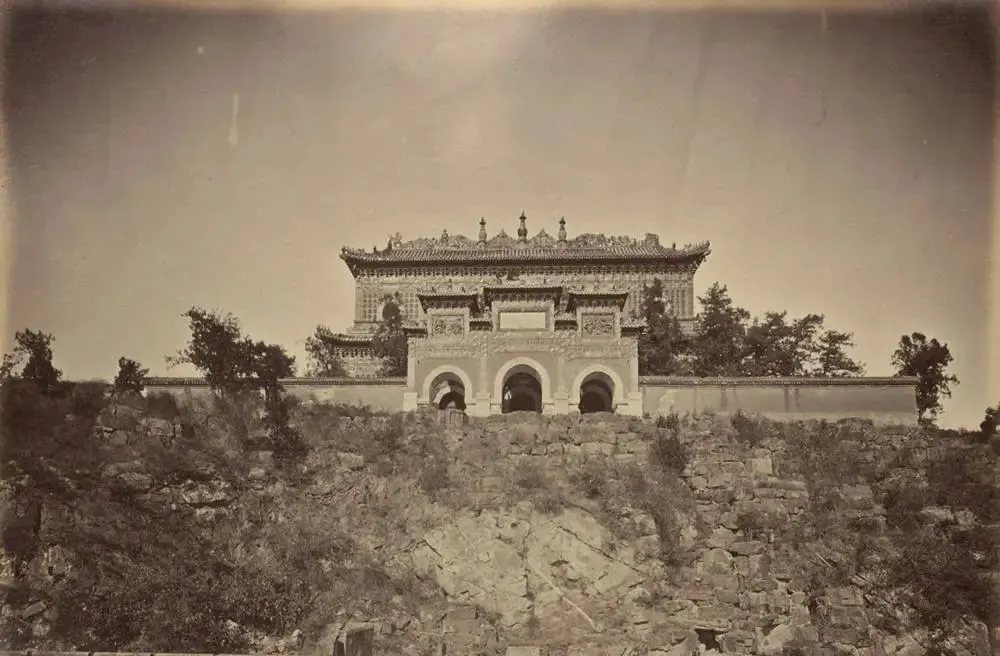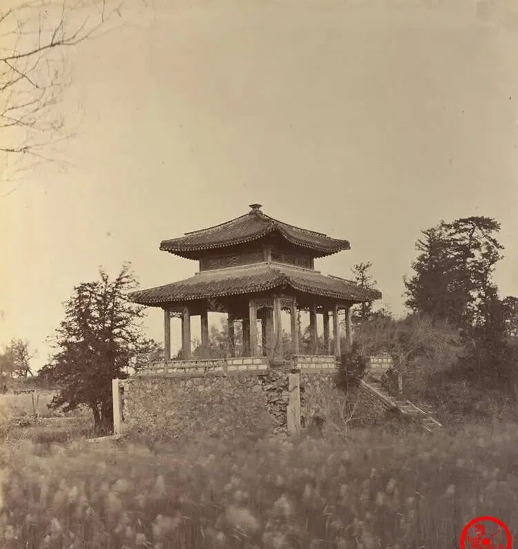 这座站在半山腰的小角亭,顶上宝顶还在,檐下瓦当缺口一圈,背后山岚起伏,城外的地界像一张摊开的浅色毯子,那时候香山玉泉山一带被火烧过的痕,还能远远看见一道黑影,现在去看春风一吹全是新绿,照片里却是另一套光景。