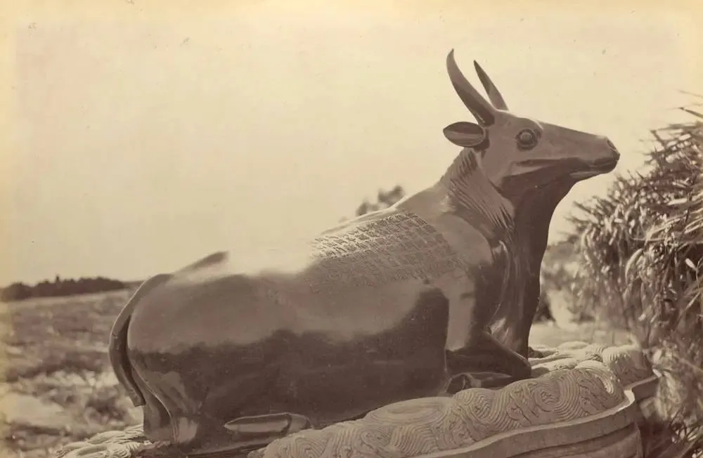 这个黑亮的家伙叫昆明湖大铜牛,牛背上的纹案像水波,脑门光滑得能照影儿,尾巴呢,听老人说那时就被砸断了,照片里看不真切,可神情还倔着,鼻翼微张,像在守着谁的誓言,奶奶以前逛颐和园老爱摸牛背,说摸摸保丰年,现在看这张老像片,心里只剩一个凉字。