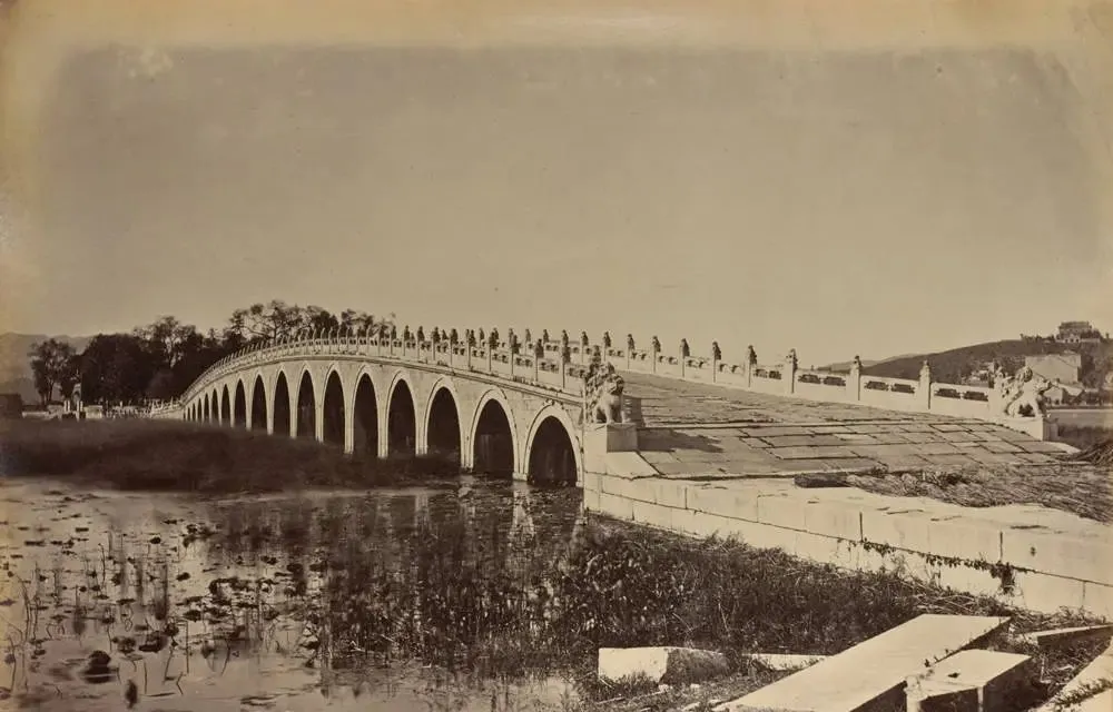 这条长长的石桥叫十七孔桥,孔洞一个挨一个像数不清的月亮,桥面石板边角崩了几块,潮水把桥脚边上的草洗得油亮,狮子蹲在栏板上,姿势还挺神气,我小时候第一次走过桥,爸在后头喊别跑别跑,石板滑,照片里看过去,人影都没一个,空得让人心虚。