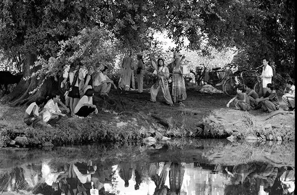 塘沿边,树荫下,十几个人、杂乱支着的自行车。这些“猫着”的人群,全神贯注的看两个演员在演戏。这便是赖征帆老师在上世纪八十年代拍摄到的送戏下乡的珍贵镜头。
