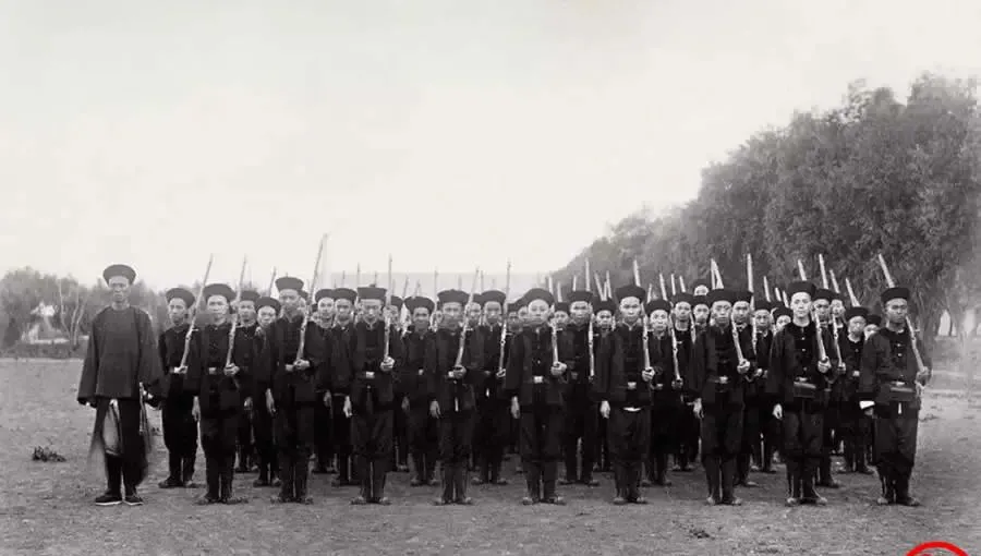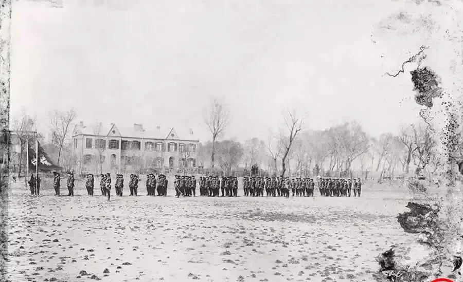 这一片空旷地面是北洋武备学堂的校场,远处是二层西式楼,近处队列分成几路,正做散开合拢的队形变换,操练依德国制式,三年学制,毕业回营里任职,爷爷当年翻老照片给我看,还笑着说“这套走法现在看也不落伍”,一句话就把那股子讲求章法的劲儿点透了。