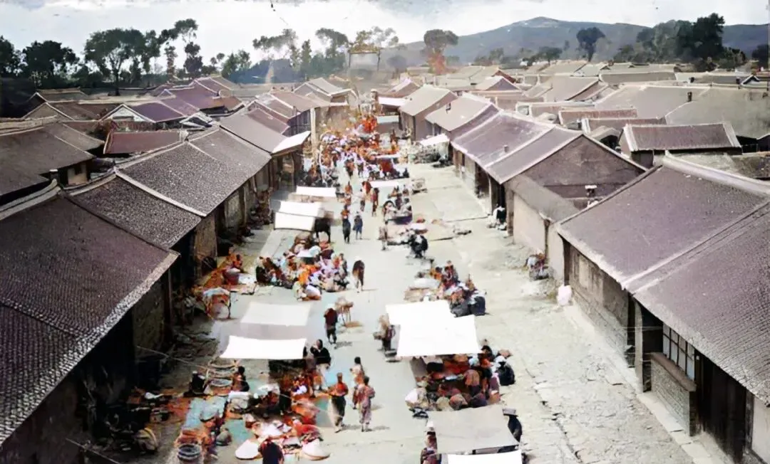 这幅热闹的是角山脚下的集市,白篷布一顶顶撑开,茶摊干果杂货铺一起摆,远山浅淡,街巷窄却挤满人,买卖人说话利索,转个身就能拎走一把锅。