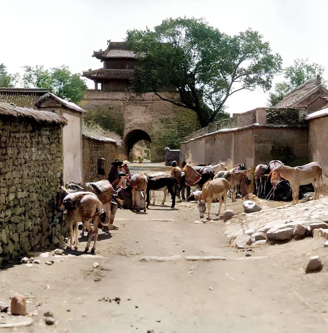 这个场景你一看就懂,驴骡骆驼挤成一片,鞍辔挂得整整齐齐,城门口树荫底下人围着讨价还价,秋末冬初买卖最旺,地主家的车队就从这儿配齐了。