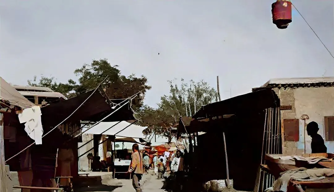 这张是小城的棚市,黑布白布搭起遮阳,光从缝里漏下来,卖布的把尺子啪地一甩,孩子在地上蹦蹦跳跳,买卖没多大,却热乎。