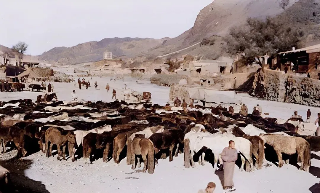 图里是张家口城外的马市,黑白花骡子挤得连缝都没了,卖牲口的攥着缰,买家把手放在背脊上按两下,价就往上抬一点,翻过年来还能再跑一趟。