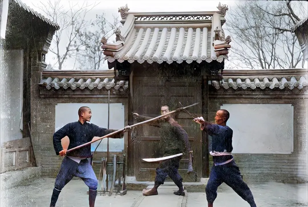 这张最带劲,三个人在院子里对练,长枪抖出寒光,院墙外是光秃秃的树,地上摆着刀枪棍棒,师父常念叨,白日耕夜里练,这身骨头才硬起来。