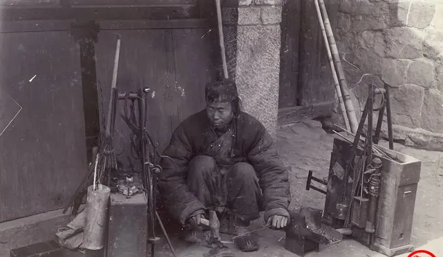 这个蹲在地上的叫走街铁匠,工具不多,风箱、铁砧、手锤,火盆里焦煤烧得噼啪响,顾客把锅底递来,他抹一把汗,锤子一抡就补上了,敲铁的回声在巷子里顶顶回荡,孩子们爱围着看热闹,娘在旁边嘱咐别太近,火星子烫人。