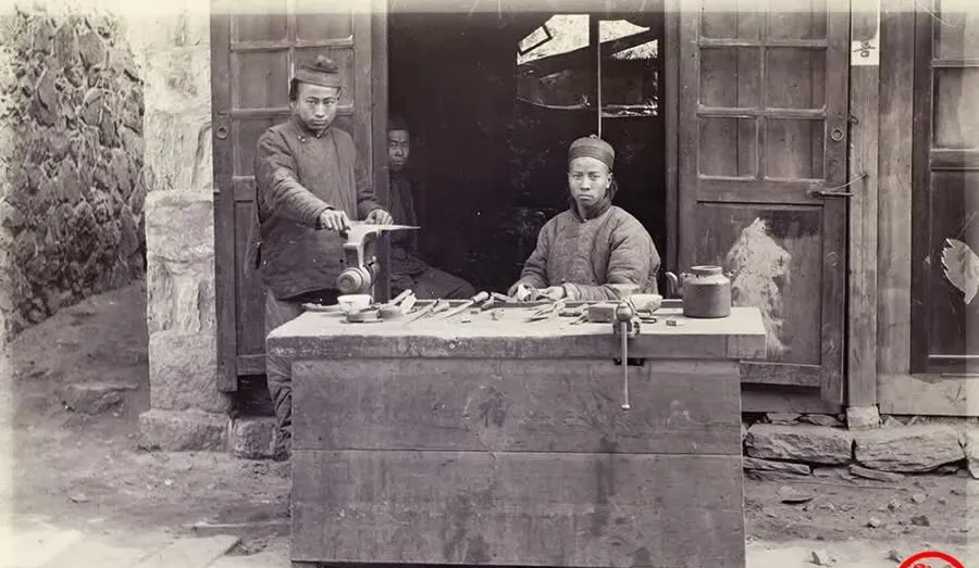 这张桌子上摆满了锉刀、虎钳、手摇磨,掌柜坐着,伙计在旁边摇着磨把儿,铁器在砂轮上吱啦吱啦直冒星子,喝水的锡壶压着单子,门匾上没几个字,却靠手艺吃饭,妈妈说家里剪子钝了就来这儿开刃,几文钱,立等可取。