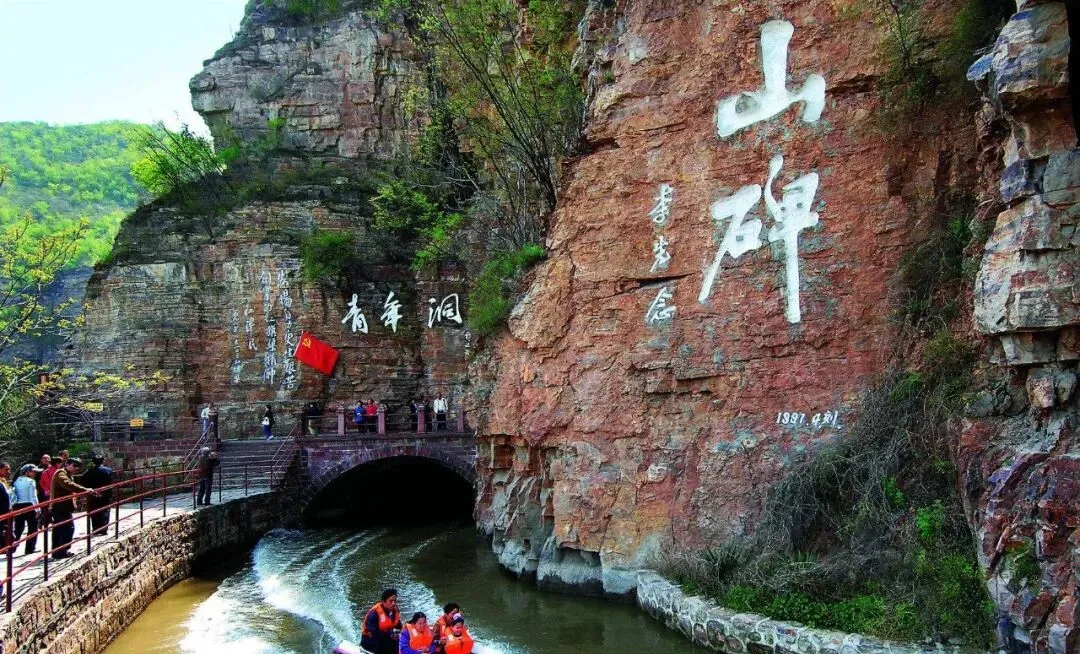 图中这处崖壁上的洞口叫青年洞,字就刻在石上,白得发亮,洞门不大,像把刀从山体里划开一道缝,里头黑幽幽一条水道伸进去,栏杆石砌,转弯就是水声拍岸的回响,站在洞口边,红旗一抖,人就跟着打了个寒颤,爷爷说这洞是年轻人硬生生凿出来的,白天凿夜里也凿,一年多才打通,放在现在,谁还肯拿锤子对着石头干这么久呢。