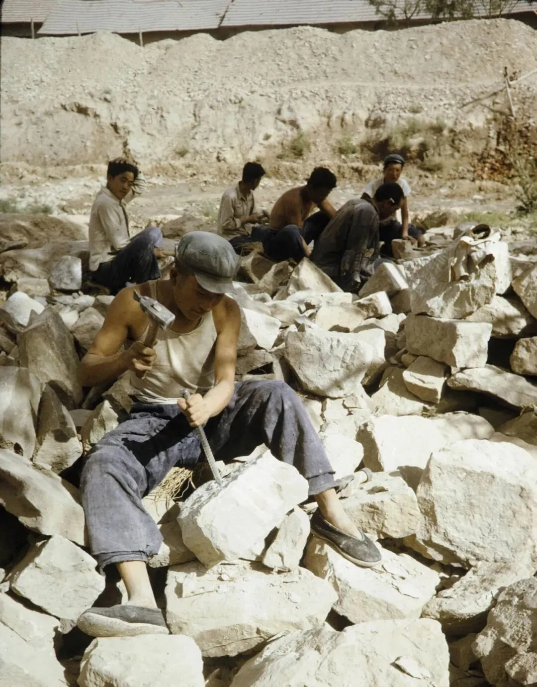 这几位手里攥的就是铁锤和钢钎,石块一块块顶在膝上,锤头抡起来砸在钎子上,叮的一声脆得很,石粉就飞起来了,袖口卷到胳膊肘,汗顺着脊梁往下流,谁家锅里也少不了他们这一锤一钎的响动。