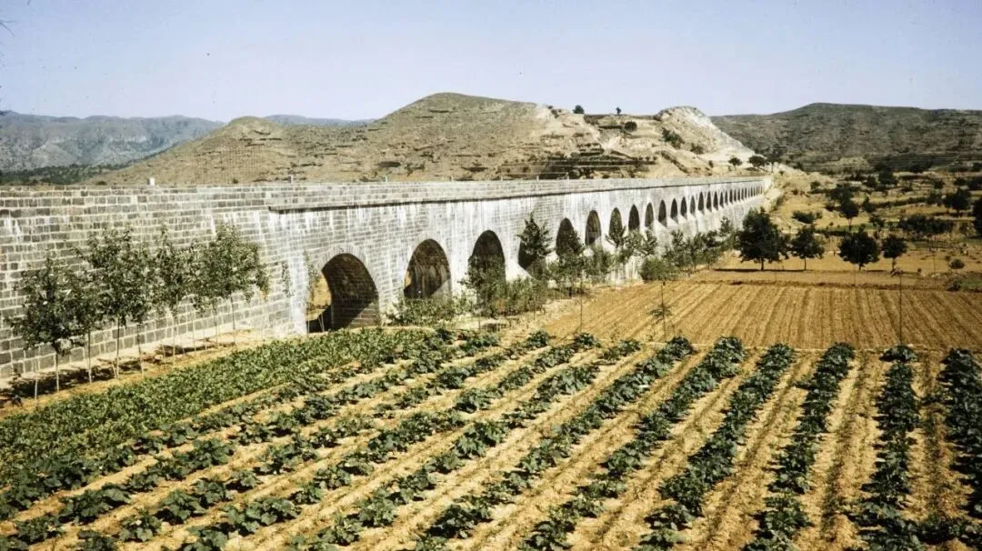 这个高架过去的家伙叫渡槽,灰石条垒成的拱,一个接一个排开去,像会走路的桥又像会吃水的龙,下面牛车驮着草慢慢走,人影在拱洞里一闪一闪,风一过,草梢响得沙沙的,过去缺水得很,这一渠水跨沟越壑抬过去,田地就活了。