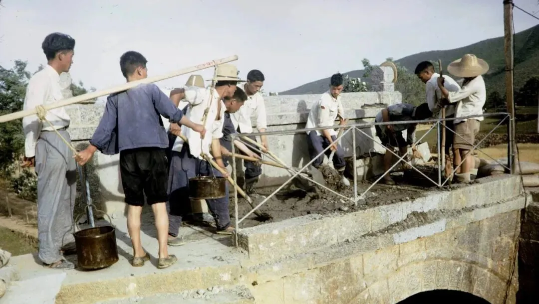 这张里头是小桥面抹浆,肩上扁担挑着铁桶,灰浆黏稠,木抹子一推一收,边角倒得利利索索,旁边年轻人袖章鲜亮,笑着喊再来一担水,桥栏杆是细铁条焊的,轻巧,却够撑手。