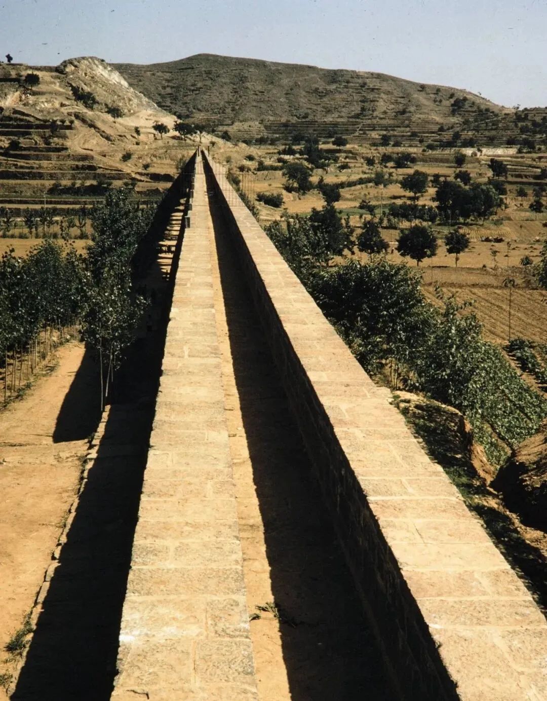 这两道平行的就是直渠墙,像两条拉直的天线,指向远处的山坳,影子把地面切成长长的三角,走在上面,人像在一把尺上量步子,脚下全是石子硌得生疼,却舍不得慢。