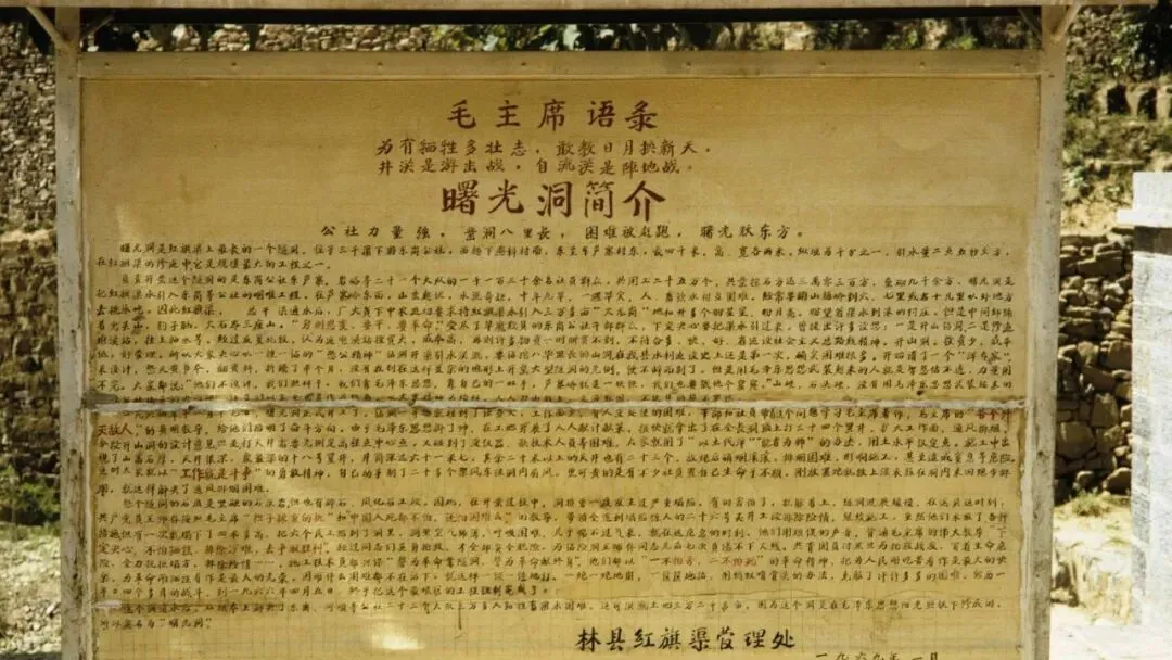 这块写满小字的就是曙光洞简介牌,字多得像蚂蚁爬,讲的是怎么开洞,怎么排险,怎么把水引到东岗去,读到“公社力量强”那行不自觉就点头,嗯,真强。