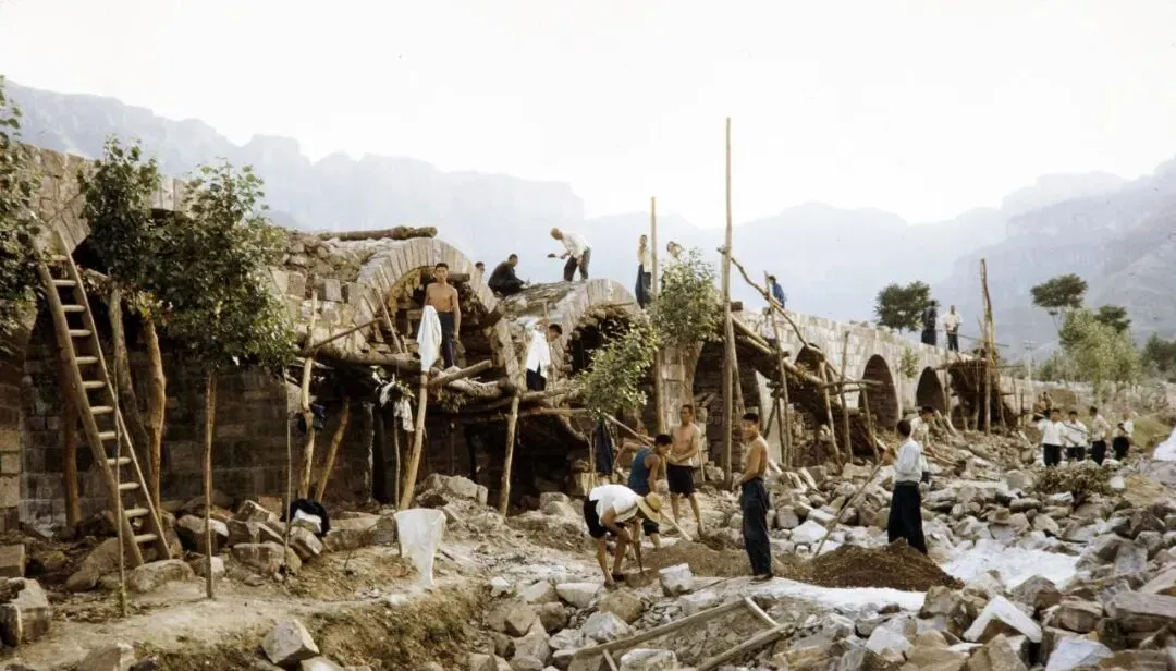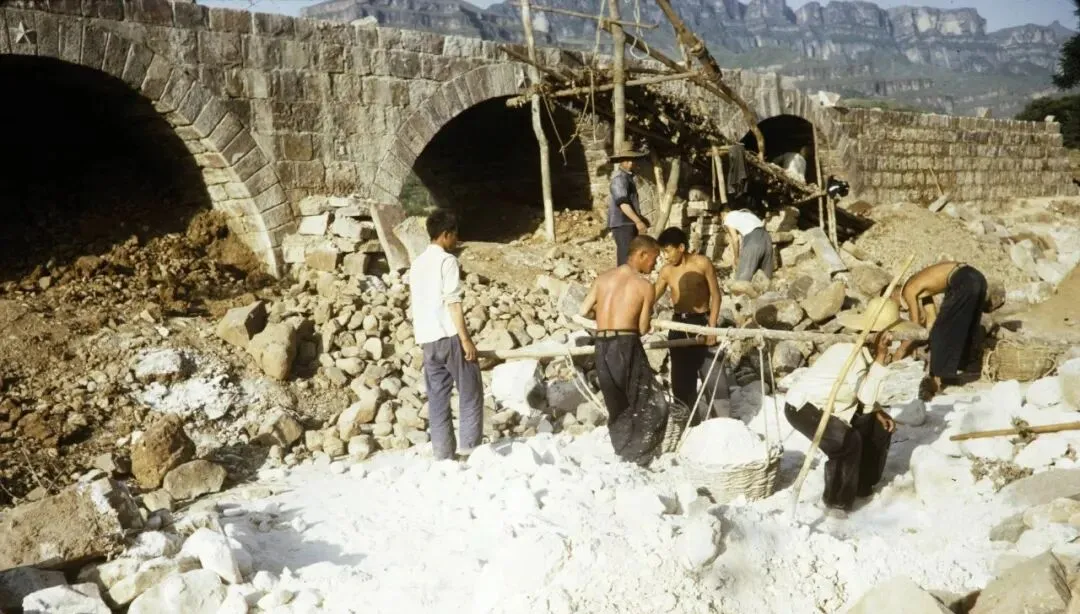 这里还是拱涵工地,木梯子斜搭,树干架上铺着树皮当垫,工友赤膊传土,石灰粉把皮鞋都糊白了,远处山影蓝得像水墨,干活的人谁也不抬头看景,光顾着一镐一锹往前赶。