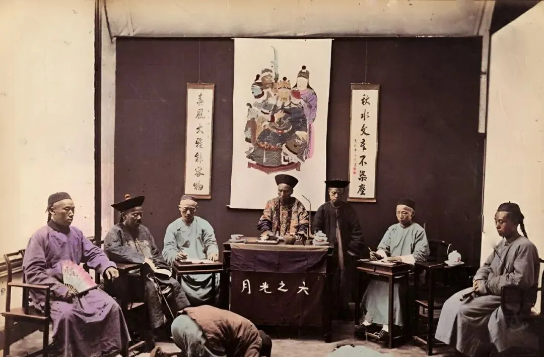 这张里头的场面叫升堂,堂桌前摆着笔砚茶盏,官帽一正两边师爷捻着胡子记口供,地上两人额头磕得响,案后中堂挂着关公像,左右楹联黑白分明,写着“六之光月”四字倒是古怪,像是影棚里临时写的,摆没摆拍你自己看,也算把衙门那口气儿照了个全。