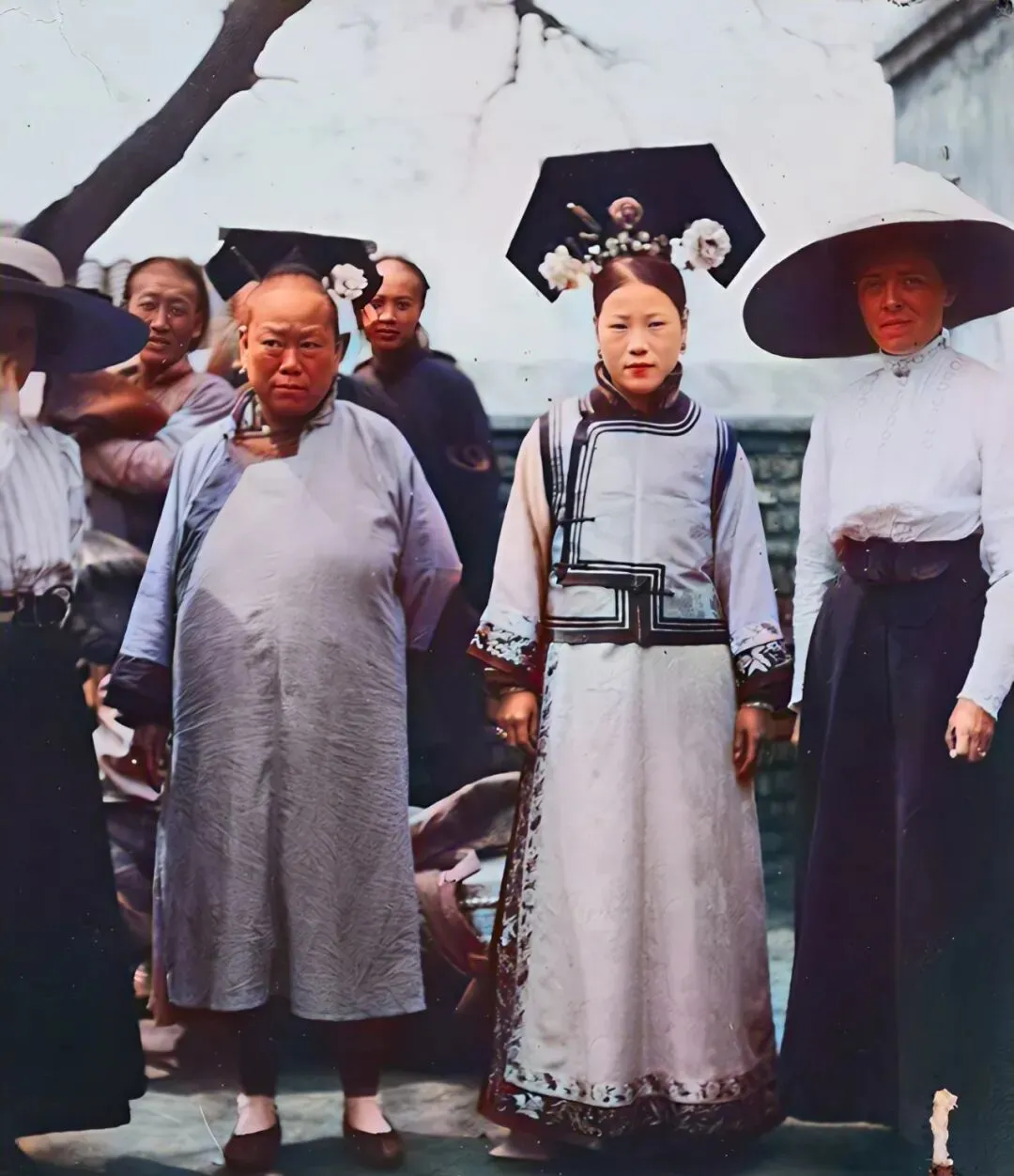 这张里边站着两位戴大檐帽的洋女人,旁边旗人女子头顶大旗头,面上粉打得匀,仆妇横着眼珠看四周,防着乱摸乱拍的生事,衣裳花边绣得细,站姿却挺硬,像一面小小的门楣。