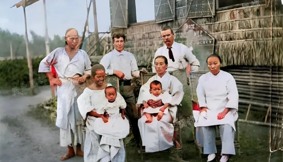 这张合影里有中有外,穿白袍的女人抱着娃,后头几位洋人站着,脚下泥地没干,屋檐是草搭的,大家笑得不整齐,却都往镜头里凑,那些孤儿的名字没人记得,照片倒留住了一点暖。