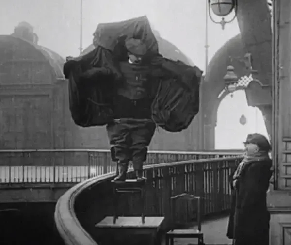 2.1912年2月4日,埃菲尔铁塔。奥地利裁缝弗兰兹·瑞切特试图制造出世界上第一个降落伞,他穿着自己设计的“降落伞”从铁塔上跳下,摄影记者拍下了这一瞬间。不幸的是,他从塔上直接摔了下来,当场身亡。但他为科学勇于探索和献身的精神值得称颂。