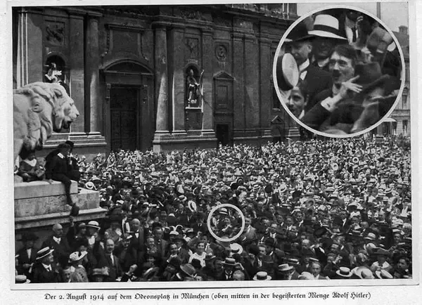 3.1914年,德国慕尼黑。年轻的希特勒在场下欢呼第一次世界大战的开始。