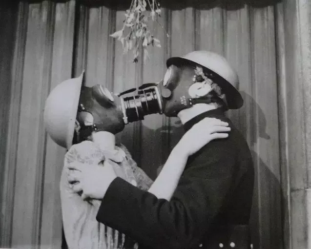 8.1940年的圣诞节,伦敦,一对情侣戴着防毒面罩接吻。不要以为这是防雾霾的高科技,而是当时的伦敦正处于德国“闪电战”的狂轰乱炸之中。