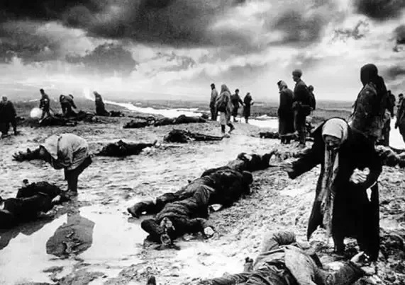 9.1942年,德国。一场犹太屠杀刚刚结束。一位母亲在认出儿子的尸体后,嚎啕痛哭。