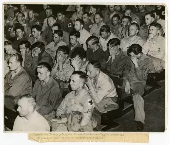 10.二战期间,纳粹士兵正在观看集中营录像带,很多人捂着脸,可以看出,他们是不情愿观看的。