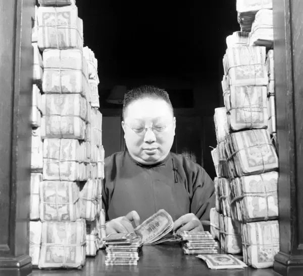 11.解放前的北京,一个掌柜的正在清点钞票。当时国战区通货膨胀严重,10亿法币仅值3400美元。