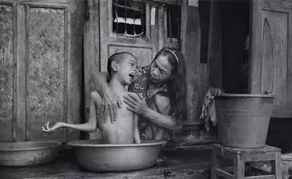 20.1958年,越南的一个小村庄。一名母亲在给自己畸形的儿子洗澡。由于越战中毒气的使用,对很多平民带来了可怕的灾难。