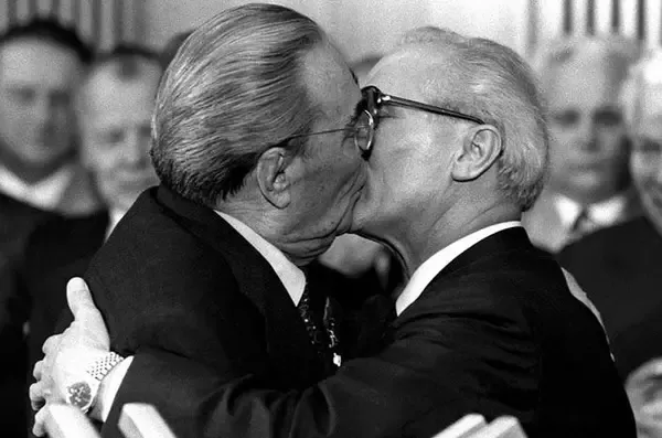 23.1979年10月4日,民主德国建国30周年庆典上,勃列日涅夫(左)与东德领导人昂纳克(右)激烈拥吻。