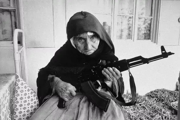 24.1990年,亚美尼亚。一名手握步枪的106岁老妪,在保卫着她的家园。