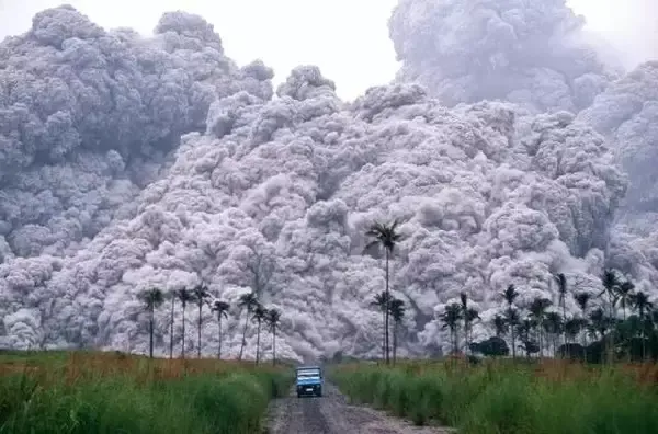 25.1991年6月17日,菲律宾。一辆小卡车正从喷发的皮纳图博火山脚下仓皇而逃,这是整个20世纪最惨烈的火山喷发之一。