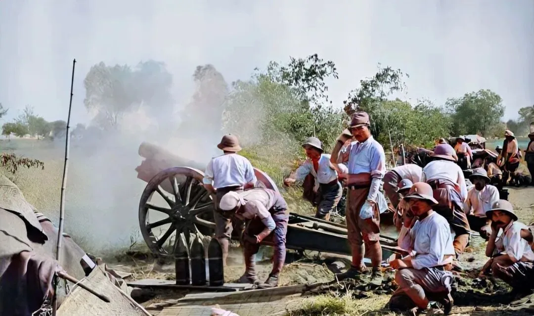 这个大轮辐家伙是野战炮,木质炮轮裹了铁皮,炮身后坐着装填的兵,地上码着黑黝黝的炮弹,炮口刚吐烟,白雾翻卷到灌丛里,站在一旁的人握着拉绳,脸上全是土,耳朵下意识往肩膀里缩,轰一下,天也像掉半块下来。