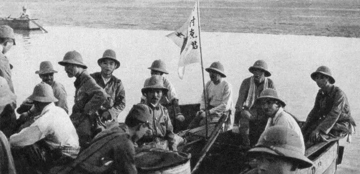 图中这些小船就是沿涡河穿梭的渡船,船板发亮,边上挂着绳圈,船头一杆小旗斜着立着,戴着斗笠样钢盔的侵华士兵挤坐两侧,河面平得发暗,水光一点不浪漫,五月的风也照样冷。