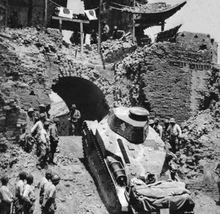 这台冒着尘土味的铁疙瘩是坦克,鼻子一样的炮塔从拱券门口探出来,城门楼塌成一堆,砖缝里全是碎石碴子,拱洞上方吊着几面旗,城墙外看客一样挤着一排人影,巷战就是这么被硬生生撬开的。
