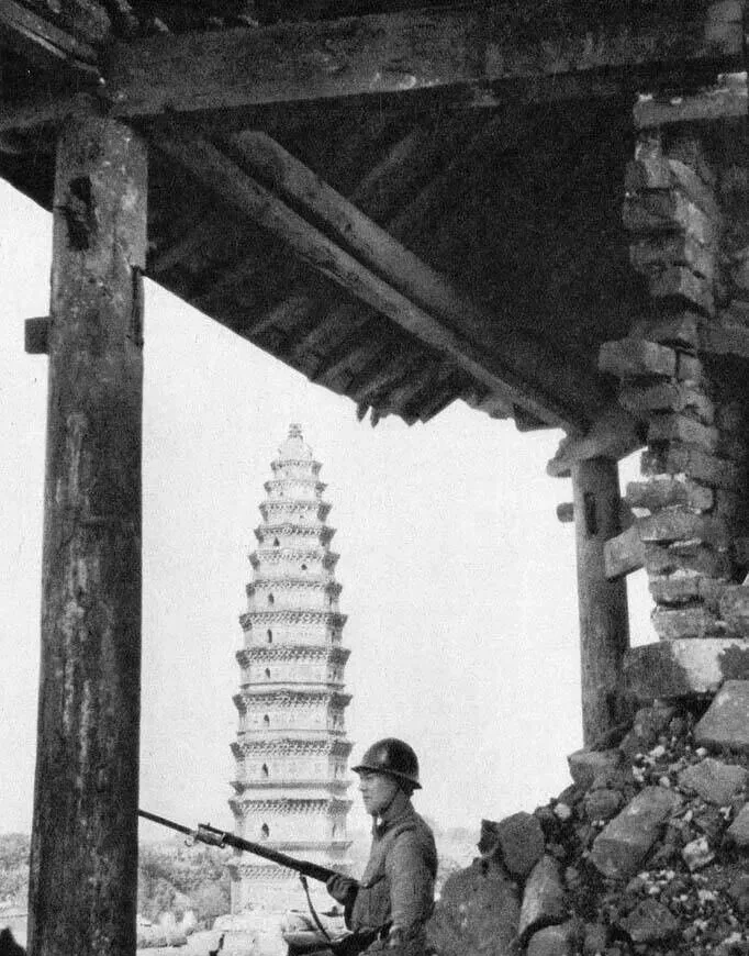 那根细长的身影是万佛塔,十三层,砖纹一圈圈勒得紧,前景木梁缺了角,暗影里一个拿步枪的身影靠着墙根坐着,头盔的边沿反着一点亮,塔在阳光下岿然不动,人却在瓦砾堆里喘气,这一静一动,把城破与不屈都照得明明白白。