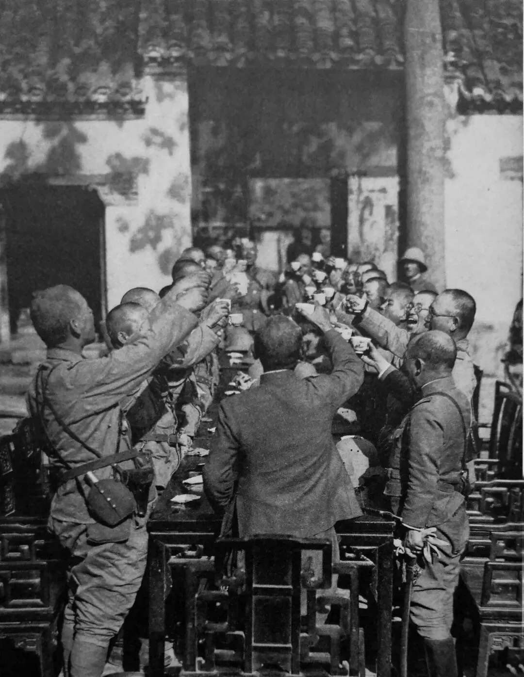 桌上摆着厚重的方几,杯盏碰在一起,光点四处跳,围成一圈的人端着酒,后院的门口抹着斑驳的树影,喊声笑声挤在一起,照片没有声音,可你一看就知道有人在说成语,也有人在抹汗,杯子举得高高的,却遮不住屋檐外的火光味儿。