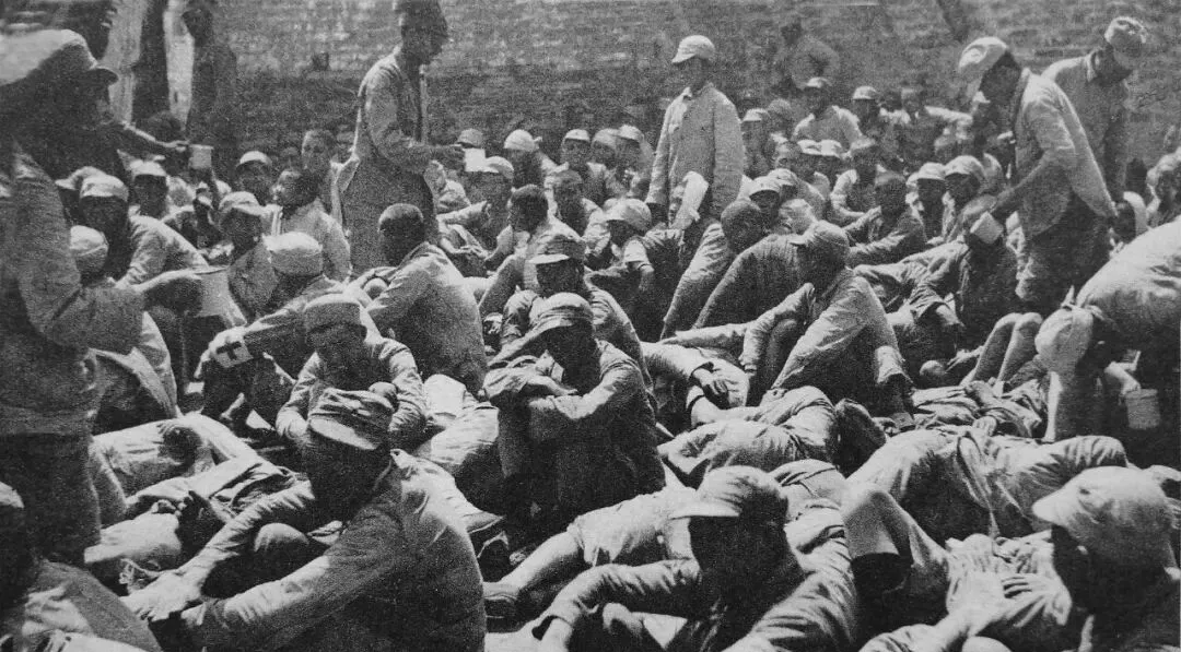 这张人挤人的操场,躺的坐的靠着的都有,臂章上有小十字,端水的人从人缝里穿过去,脸被太阳晒得发黑,帽檐塌下半寸,生与死就隔着一只铁杯,照片里没有哭,风从墙头刮下来,也只能吹动尘土。