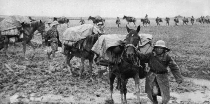这些披着油布的包裹压在驮马上,四蹄在泥里拔不出来似的,牵马的人把缰绳攥得紧紧的,雨后地面一脚一个坑,队伍还得拉成线,补给就这么一点点往前拱,谁都知道慢一点就是命慢一点。