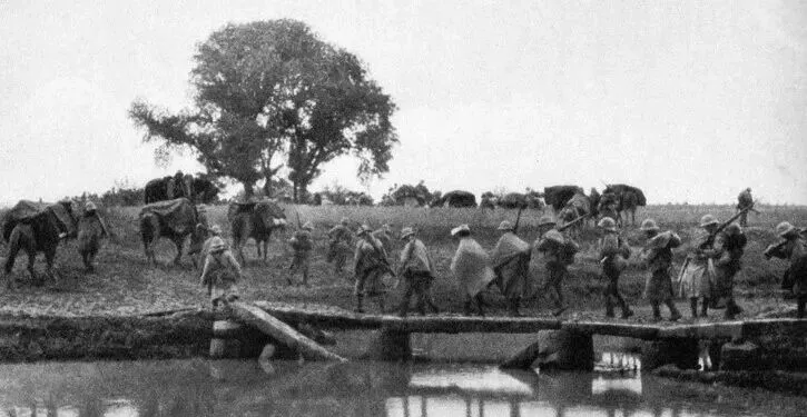 这座木桥窄到只能一人一行,桥下水面黑得像墨,岸上树冠鼓成一团,队伍披着雨披,背上插着刺刀和伞柄,马驮着箱子慢慢趟过去,夜里渡河,没有鼓点,只有木板吱呀。