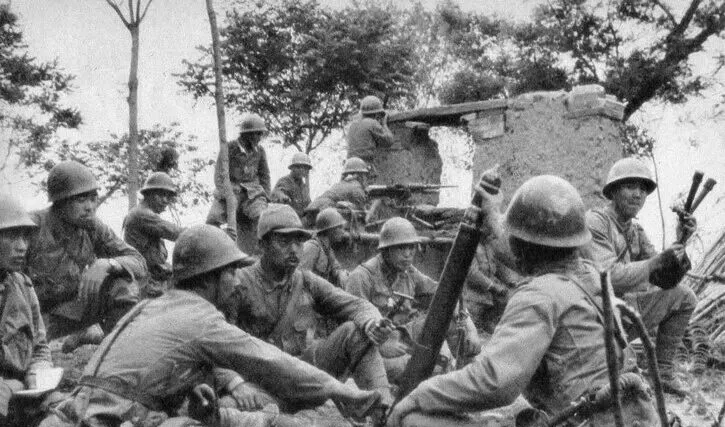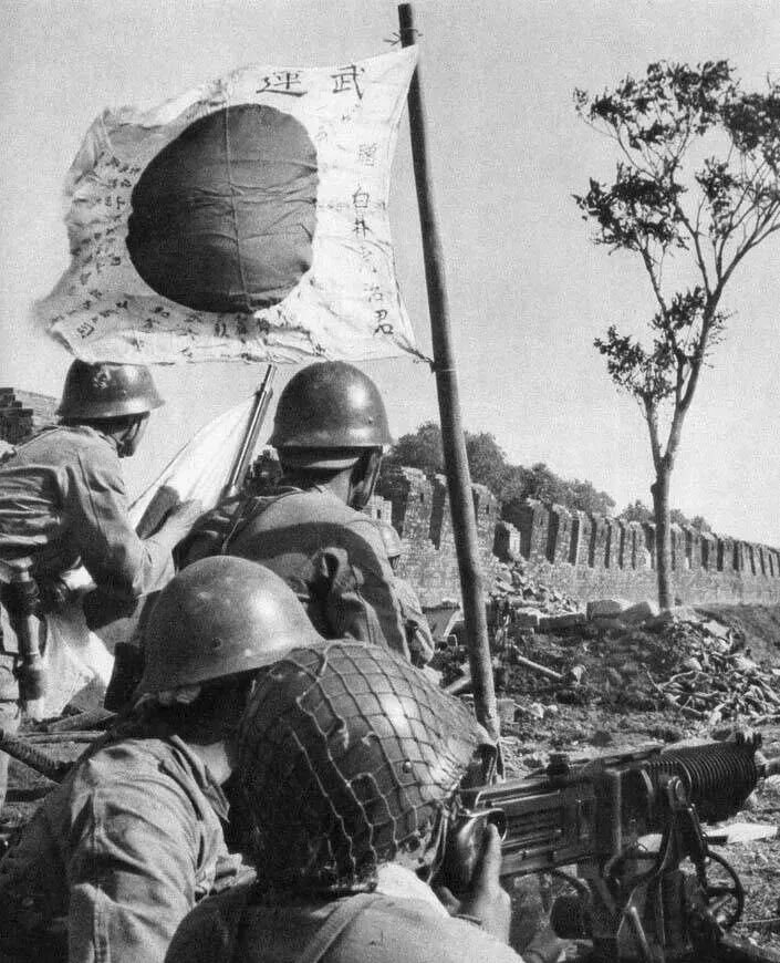 照片里那面破布上画着圆,杆子插在土包边上,几个人趴在机枪后,弹链像冷蛇一样拖在手背上,远处的城墙一格一格,像算盘珠子,风一吹,旗抖两下,子弹就顶着风过去了。