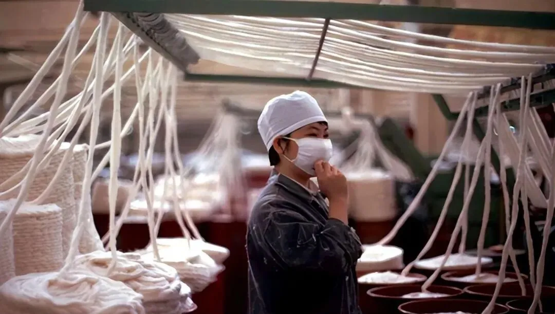 这个场景叫纱厂,粗粗白绒绳像河一样从轨道上垂下来,女工戴着口罩和白帽,手指经常被纤维蹭得发干,妈妈说上夜班最考人,机器一开,轰鸣能把人说话声吞了。
