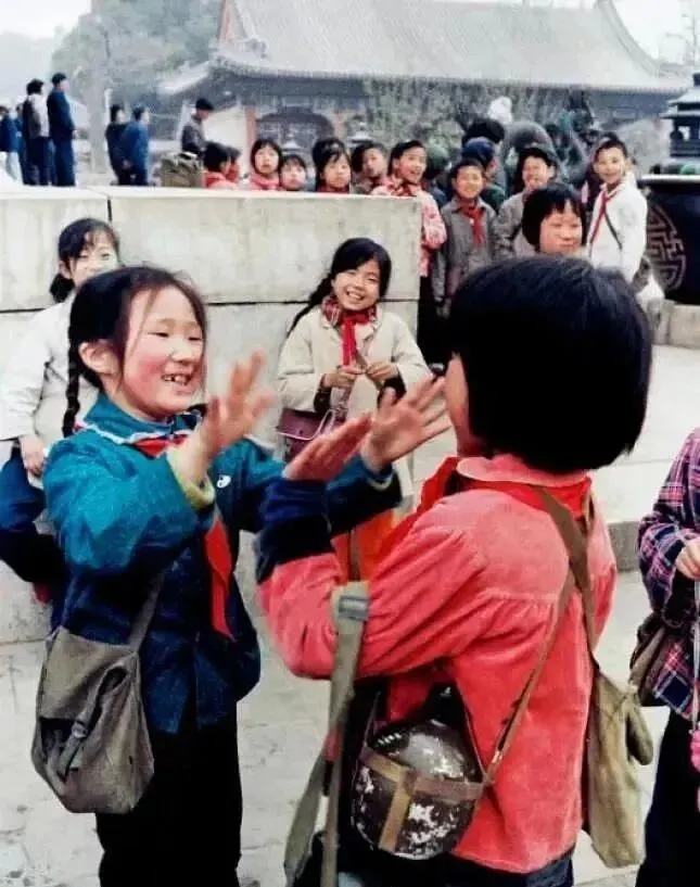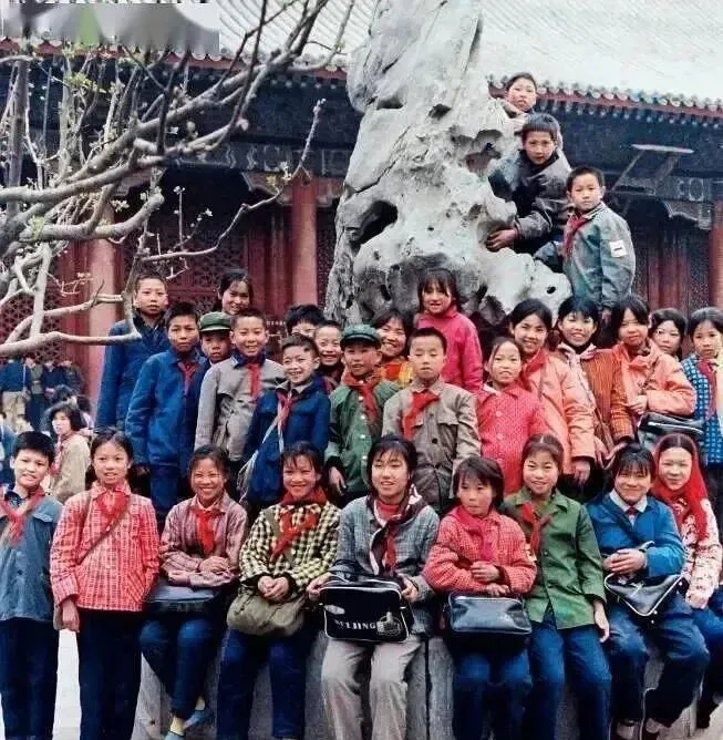 看这张,红领巾一片亮,帆布包歪在肩上,穿花棉袄的多,大家挤在太湖石前笑得直眯眼,老师举着海鸥相机喊别动,咔嚓一下就定格了春游。