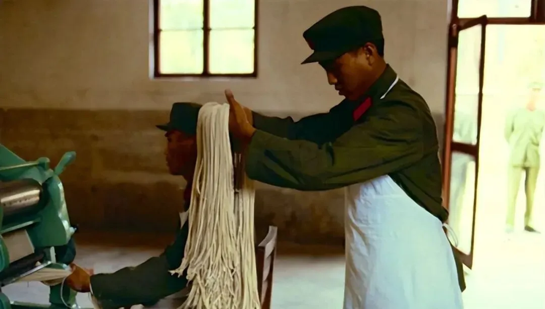 这台机器叫压面机,照片里战士两手端着面条像抱了一捆雪,另一位用力摇把,轧出来的面顺顺溜溜落在竹筐里,炊事班的香味,是我们对部队的第一印象。