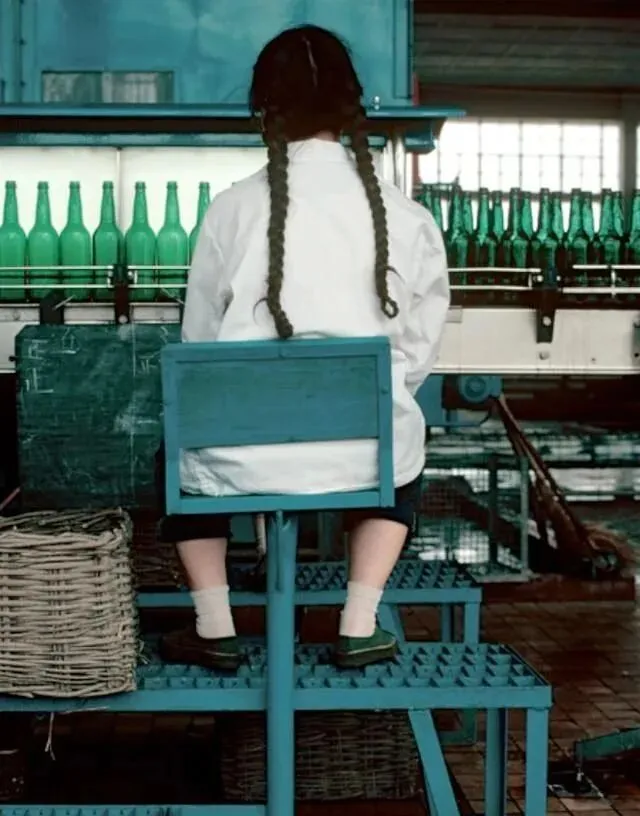 这张在啤酒厂,绿色玻璃瓶排成队,一闪一闪的,女孩坐在蓝色高脚凳上检查瓶口,两个麻花辫垂到凳背,动作一刻不停,那会儿厂里流行发肥皂票当小奖。