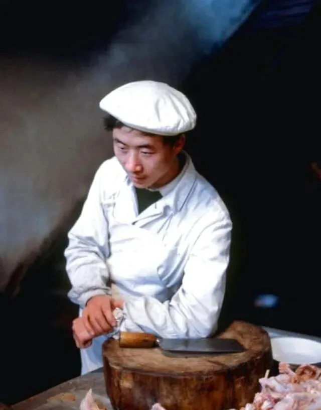 这位戴白帽的师傅靠在菜墩边歇一口气,袖口卷到手肘,案上大刀沉甸甸的,烤鸭片得薄,蘸糖卷葱,咬一口油汪汪的香,那是北京味儿的底气。