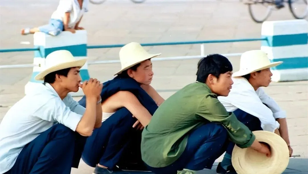 这几个小伙子戴草帽蹲在广场边,汗沿着脖颈往下淌,手心攥着工票或路费吧,进城打工的头一年都这样打量世界,先看看,再出手。